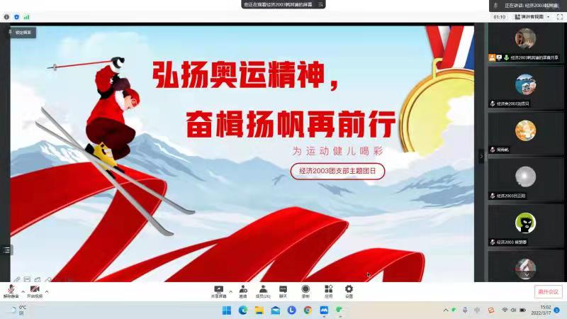 2022年3月17日15:00,经济2003团支部于线上开展了“奥运精神催奋进·学习雷锋启新程”主题团日活动。经济2003团支部全员参与本次团日活动,班导师向涛、辅导员王守智应邀出席。