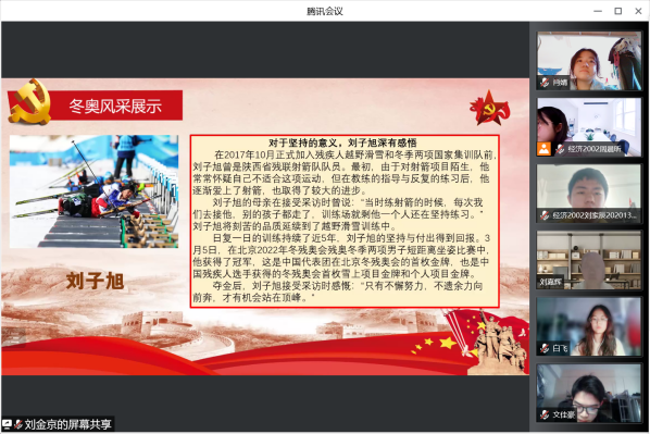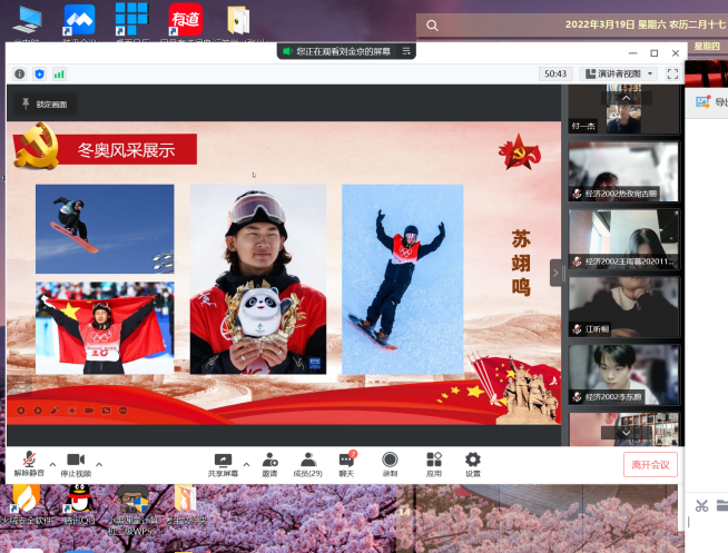 为传承不朽雷锋精神,走近北京冬奥,感受冰雪魅力,3月19日,经济2002团支部于线上开展了以“奥运精神催奋进·学习雷锋启新程”为主题的团日活动,本支部全体成员参与本次活动,班导师李亚宁、辅导员王守智应邀出席。