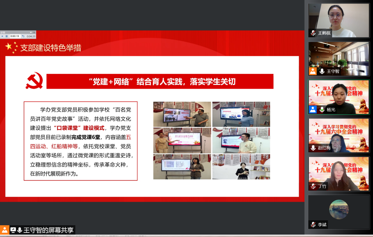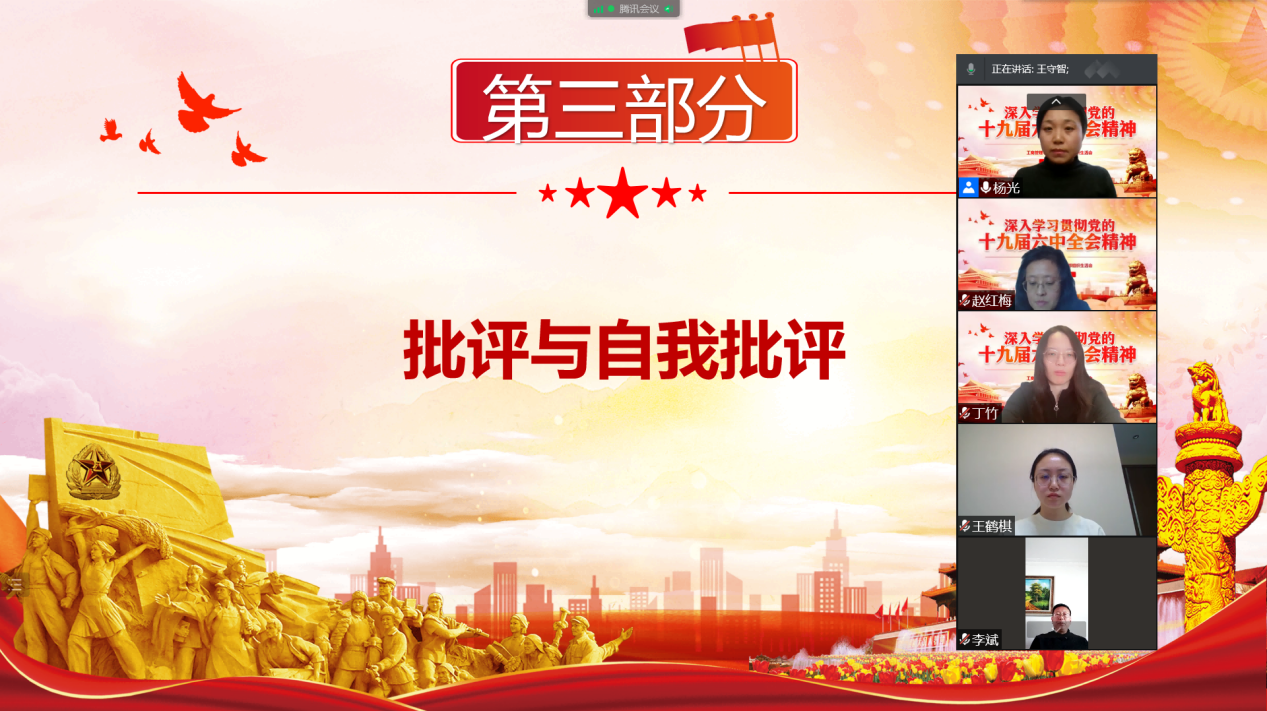 会上,支部全体党员共同学习习近平总书记在党的十九届六中全会上的重要讲话精神,特别是重点学习了《中共中央关于党的百年奋斗重大成就和历史经验的决议》学习资料。支部书记杨光作2021年支部工作报告,总结支部围绕党史学习教育和学生工作实际,在疫情常态化的特殊挑战下,打造“党建+制度”“党建+信仰”“党建+网络”“党建+文化”党史学习新模式,明确建设目标,加强理论学习,切实发挥党支部的战斗堡垒作用和党员的先锋模范作用,不断强化全心全意为学生服务的宗旨意识。