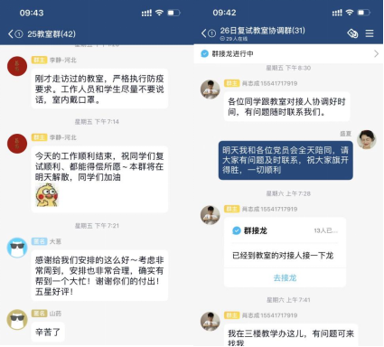六天时间内,24位党员积极投身活动,负责14个场地协调跟踪。每天早七点场地负责人全天待命,为处理紧急事项做好充分准备。场地负责人严格按照学校学院疫情防控要求,确保人员不聚集,做到提醒候场,也帮助复试同学节省了等待的时间;场地负责人除协助复试同学调整复试设备,还给予心态上的支持鼓励和暖心祝福;每次场地使用完毕,党员同学负责清理垃圾、摆放桌椅、切断电源、关好门窗。