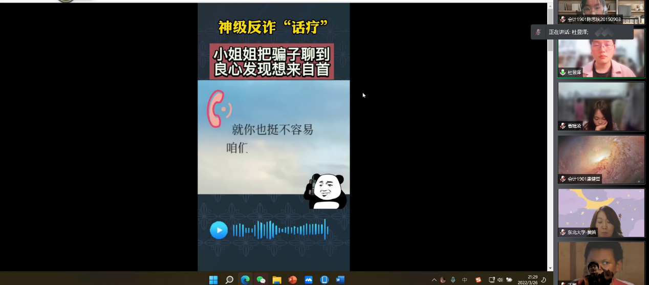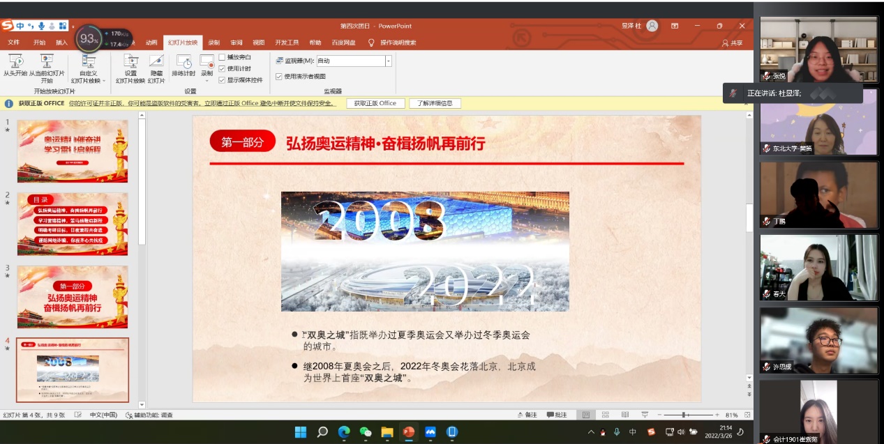 2022年3月26日,会计1901团支部线上开展了“奥运精神催奋进·学习雷锋启新程”主题团日活动。国际教育学院副院长樊笛、班导师黄训江、辅导员芦书豪应邀出席。