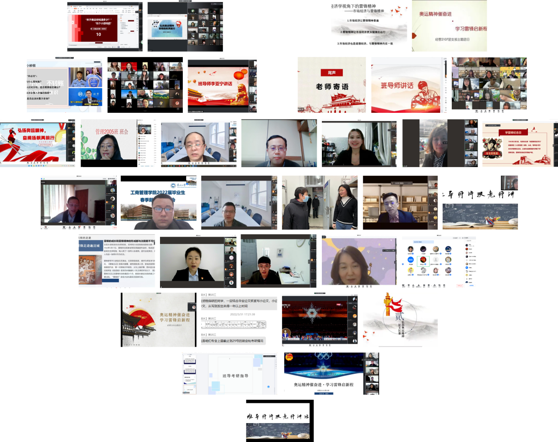 3月16日以来,近30余位中层领导干部和班导师深入学生群体开展育人工作。蒋忠中、任丽、樊迪、郁培丽、孙新波、贾建锋、王健、赵红梅、严立宁通过云端会议、一对一谈心等方式深入学生群体,与同学们就校园封闭管理期间的学习状态、就业选择、疫情形势等方面展开深入交流。蒋忠中指出校园封闭管理期间,同学们要遵守校园管理规定,建议同学们要加强学习,强化数理逻辑思维能力,提高计算机与英语水平,浇筑起求学深造的坚实基础。任丽邀请同学们走进办公室,与学生开展一对一谈心,围绕封校期间的思想动态、学习生活、班级建设等方面与同学们进行交流,了解学生关切。樊迪关心同学们在疫情期间的日常生活和健康状况,号召同学们积极响应国家和学校的防疫要求,齐心协力共抗疫。郁培丽鼓励同学们通过学习来锻炼思维、训练分析问题和解决实际问题的能力,跳出课本,广泛阅读,感受不同思想之间的交流和碰撞。孙新波提醒同学们把握机遇,忌浮躁,稳求进,拿出战斗状态,同疫情战斗,同自己战斗,把当下的每一件事情做好。贾建锋提出同学们要凝心聚力、共克时艰,同时积极参与创新创业活动,上好创业教育这堂大学生必修课。王健将北京冬奥精神与校园战疫过程中的拼搏与温情、学生未来学术发展和金融专业实际相联系,鼓励同学们坚定信念、脚踏实地、拓宽视野、学以致用。赵红梅建议同学们要结合当前形势明确好自己前进的道路,并持之以恒地为之奋斗。严立宁围绕就业工作面向毕业生开展动员,鼓励同学们要端正心态,积极面对。班导师张翠华、张昊、刘汝萍、陈桂云,李曼宁、许波、曲道钢、程富、黄训江、李伟伟、李亚宁、向涛、史云、邱锐、王昱、孙洋、闫佳祺、周清与同学们云端相约,纷纷参与到班团会当中,围绕冬奥精神、雷锋精神谈青年学生的责任与担当;围绕专业选择、学业规划提醒同学们要勤奋努力,不负韶华;同时各位班导师叮嘱同学们要遵守封校期间学校的相关规定,合理作息,提高身体素质。