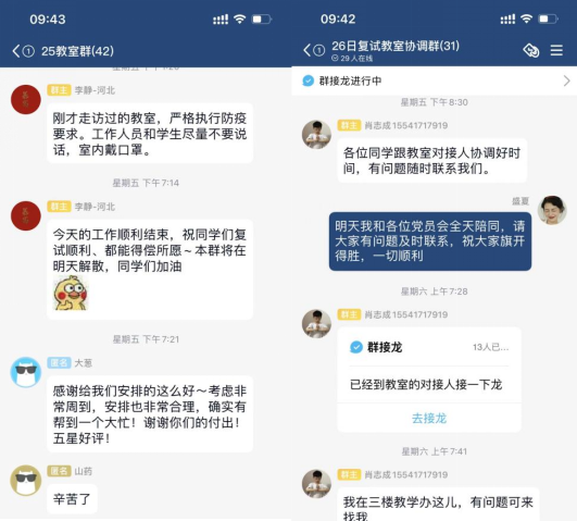 复试开始前,党支部通过问卷调查,提前了解同学们的复试时间安排和需求,精心设计场地分配方案,积极联系学院申请复试场地并保证每个场地配备一位负责人,最大限度满足复试同学多样化的需求。在复试进行过程中,24位党员积极投身活动,负责14个场地协调跟踪。场地负责人严格按照学校学院的疫情防控要求,确保人员不聚集,提醒同学有序候场,帮助调整复试设备,送上鼓励和暖心祝福。复试结束后,党员同学负责清理垃圾、摆放桌椅、切断电源、关好门窗。