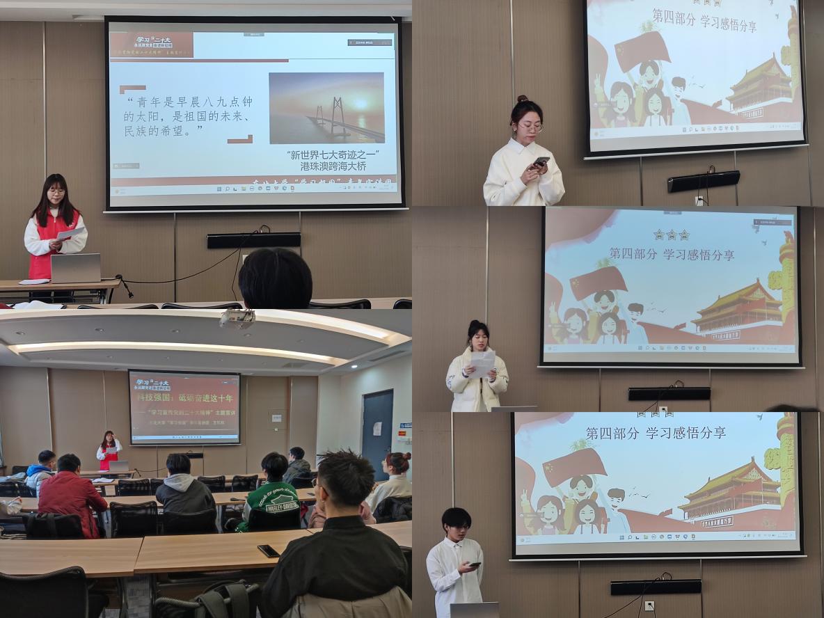 本次活动采取线上线下相结合的形式组织开展,支部成员通过集体观看二十大报告金句视频、撰写心得体会,深入学习党的二十大精神,并以感悟分享、知识竞答等形式对学习成果进行了展示。东北大学“学习报国”青年宣讲团成员王忆欣围绕两位东大杰出校友的成长经历进行的“科技强国:砥砺奋进这十年”主题宣讲,坚定了同学们的理想信念,让青春之花在奋斗中绽放。