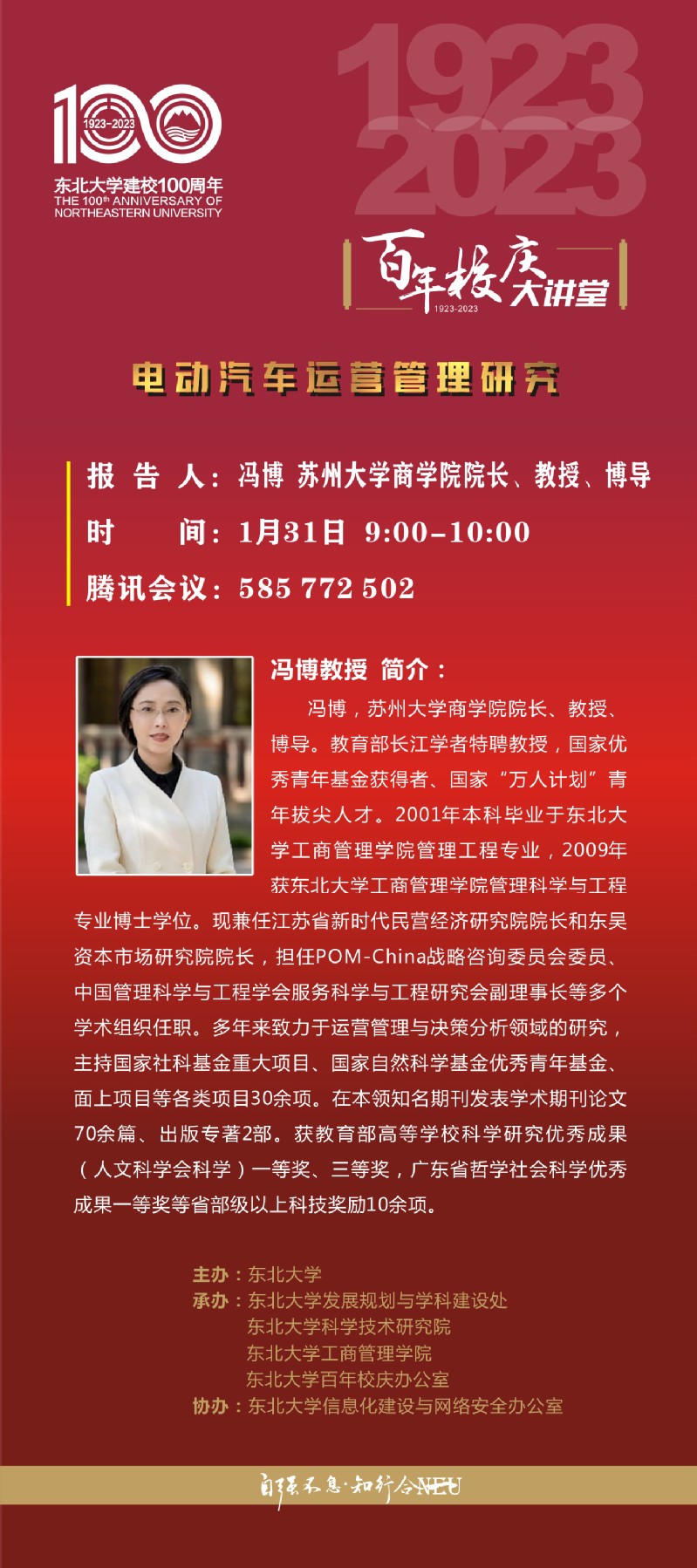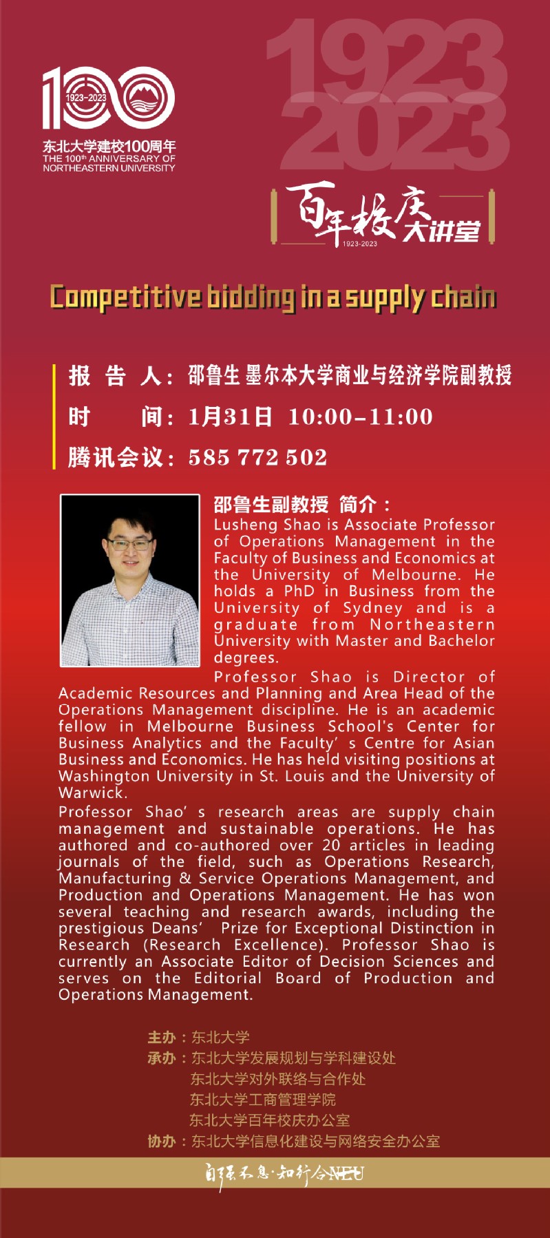 兔年新春喜迎东北大学百年华诞,“东大合家欢、新春庆百年”系列活动已拉开帷幕,1月31日上午是“百年校庆大讲堂”工商管理学院专场,学院邀请来自美国德州大学圣安东尼奥分校孙明和教授、苏州大学商学院院长冯博教授、澳大利亚墨尔本大学邵鲁生副教授、中国科学技术大学郭晓龙副教授4位知名学者&校友代表分享精彩主题报告,诚挚邀请广大师生积极参与,开启兔年第一场校友学术盛宴!
