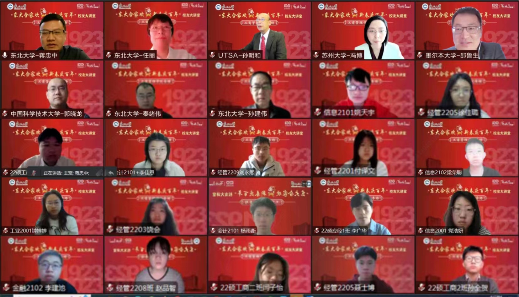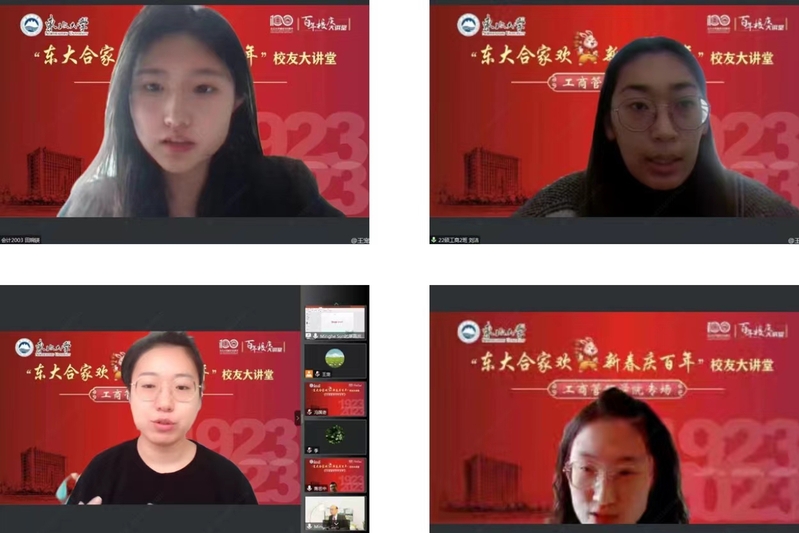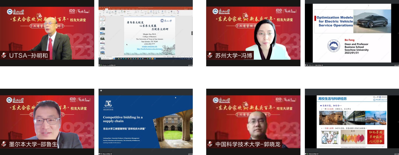 兔年新春喜迎东北大学百年华诞,2023年1月31日上午,“东大合家欢、新春庆百年”校友大讲堂工商管理学院校友专场学术报告会于云端顺利举行。学院邀请来自美国德州大学圣安东尼奥分校孙明和教授、苏州大学商学院院长冯博教授、澳大利亚墨尔本大学邵鲁生副教授、中国科学技术大学郭晓龙副教授4位知名学者、校友代表分享精彩主题报告。工商管理学院院长蒋忠中教授、党委书记任丽老师、党委副书记兼副院长严立宁以及学生工作办公室全体老师出席活动,700余名师生、校友共同参会。报告会由蒋忠中主持。