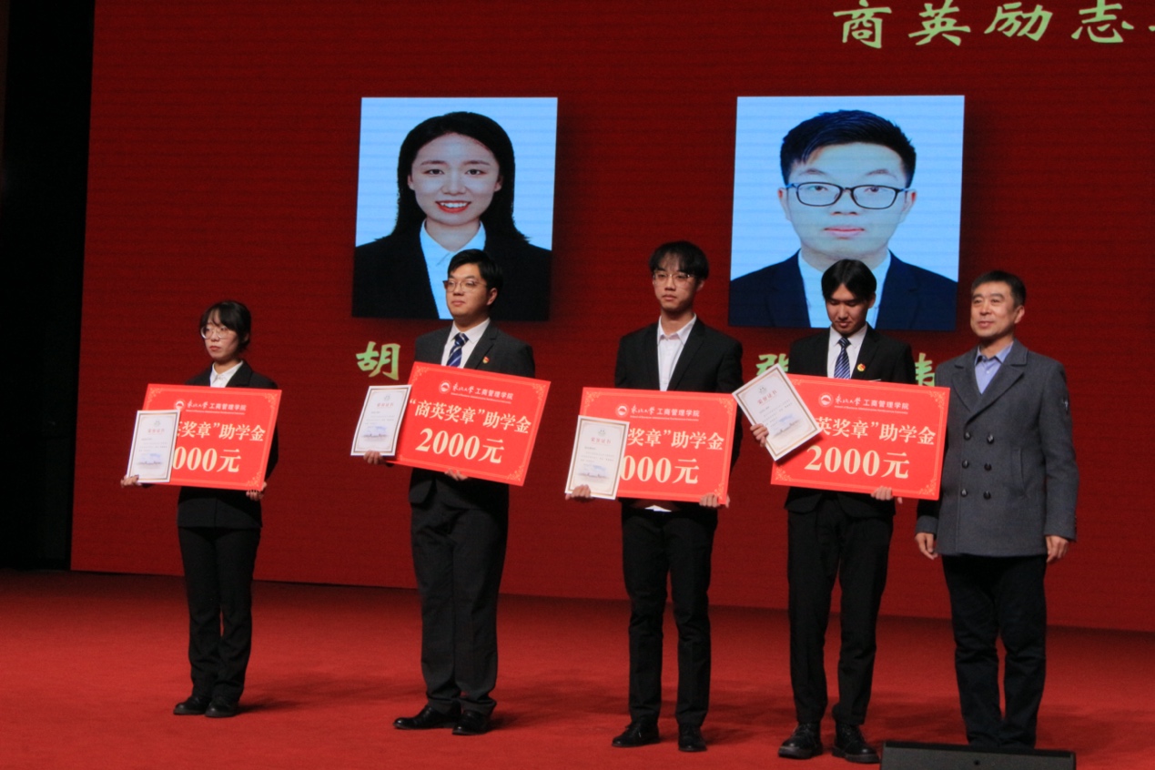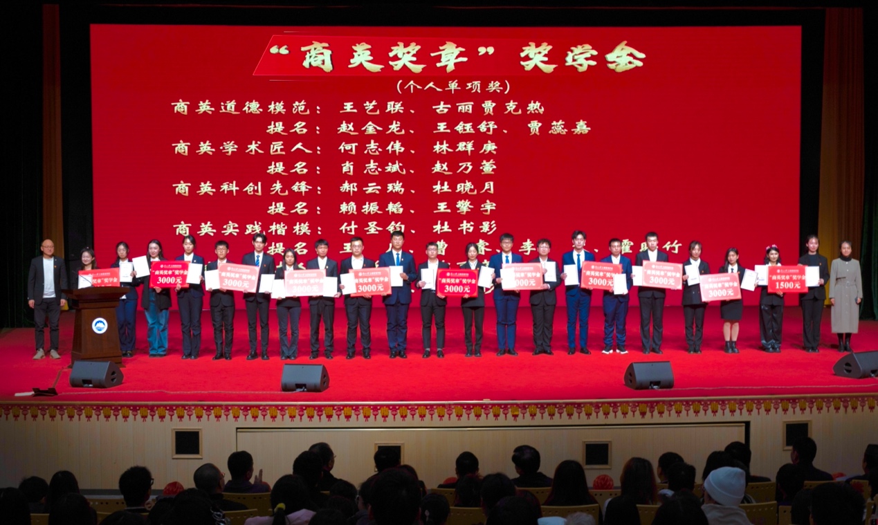 张迪宣读第七届商英奖章表彰文件,张忠英、欧阳恒岳、杨定鹏和刘云飞分别上台为获得“商英奖章”单项奖、提名奖、团体奖和商英励志之星的同学颁奖。