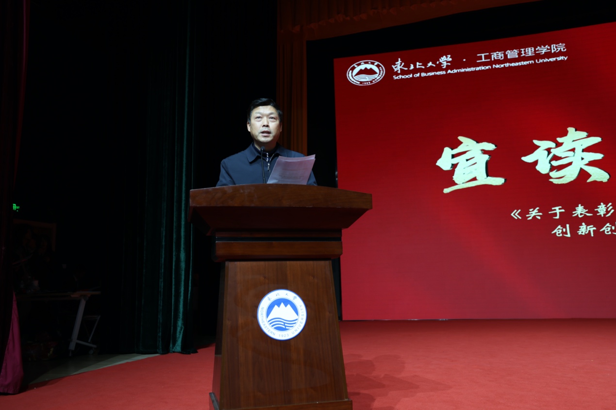 李鹤宣读2023年“创新创业”优秀指导教师表彰文件,闫研、刘延晖为获奖教师颁奖;张哲宣读第七届“德馨业勤”班导师表彰文件,中国工程院院士、东北大学校长冯夏庭为获奖教师颁奖。