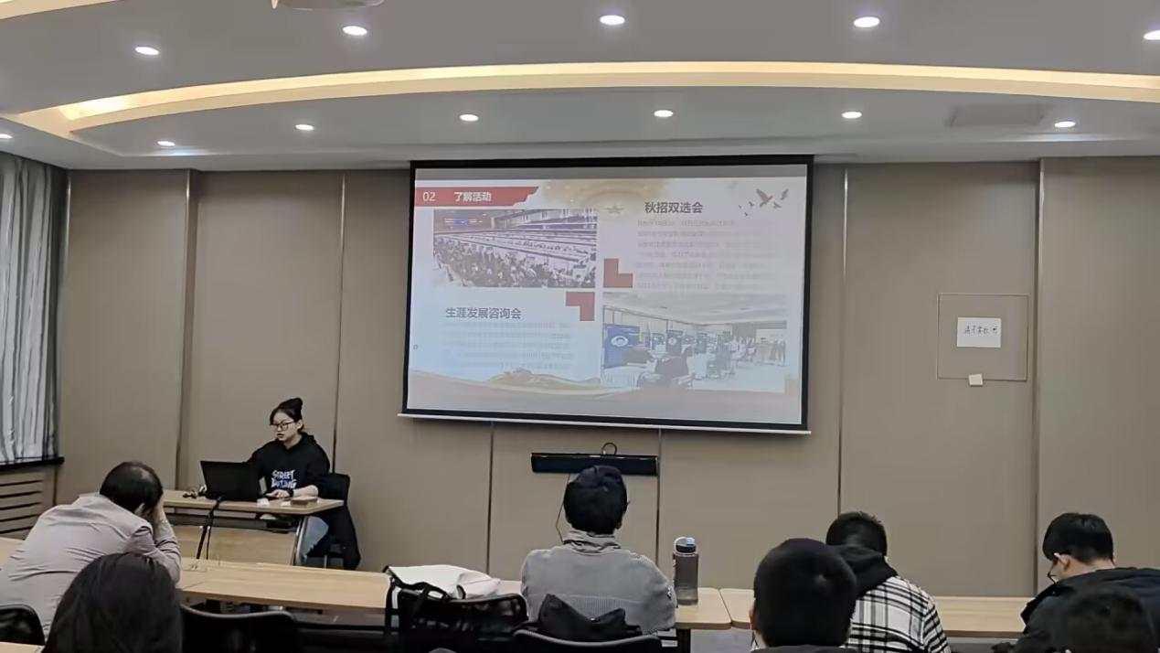 随后,团支书给大家介绍了我校秋季双选会情况,希望同学们树立正确的就业观,为就业早做准备。