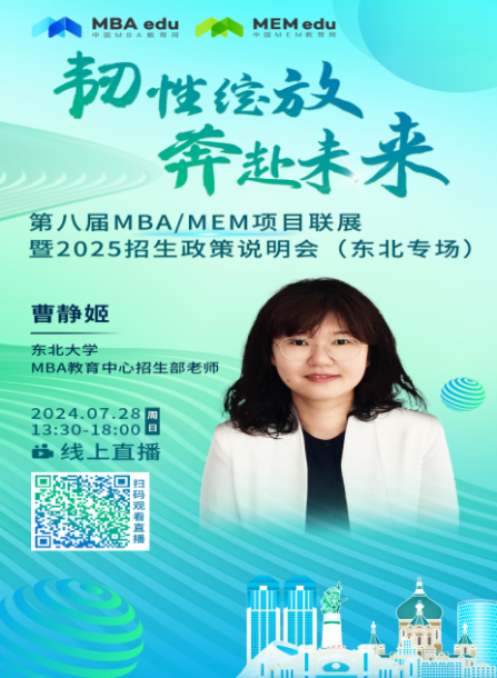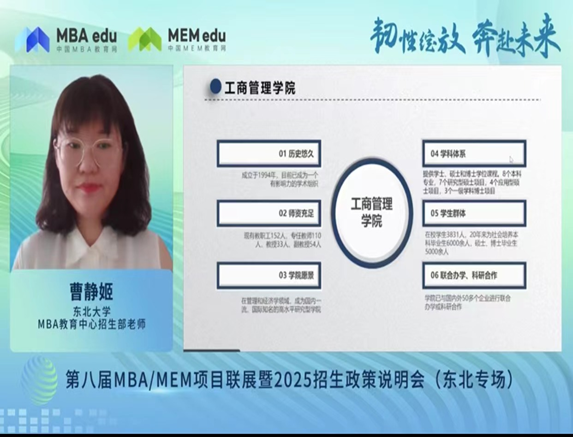 2024年7月28日,由中国MBA教育网主办的第八届MBA/MEM项目联展暨2025年招生政策发布会(东北专场)以线上形式成功举行,共同探索东北地区MBA/MEM项目的优质资源和最新招生动态。东北大学作为东北地区MBA教育项目知名培养院校之一参与了本次招生政策发布会。线上参与考生人数达2000余人。