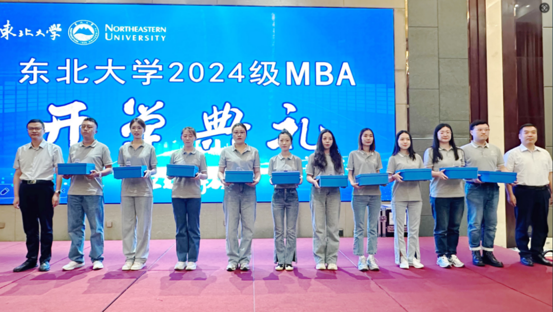 东北大学MBA校友会会长陈迪、第二十一届MBA联合会主席高明志、2024级MBA新生代表姜姗分别从MBA校友会、MBA联合会及新生角度进行了精彩发言。学院领导为2024级MBA新生代表颁发纪念品及佩戴校徽。