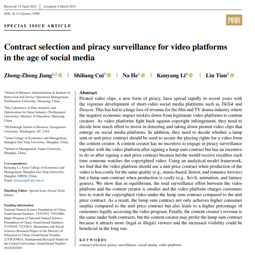 2023年3月,东北大学工商管理学院蒋忠中教授作为第一作者的研究成果“Contract Selection and Piracy Surveillance for Video Platforms in the Age of Social Media”在UTD24期刊Production and Operations Management上在线发表,研究成果由东北大学工商管理学院蒋忠中教授、何娜博士后、李坤洋硕士(现为上海交通大学安泰经济与管理学院博士生)、美国乔治城大学McDonough商学院Shiliang Cui副教授、复旦大学管理学院田林教授合作完成。