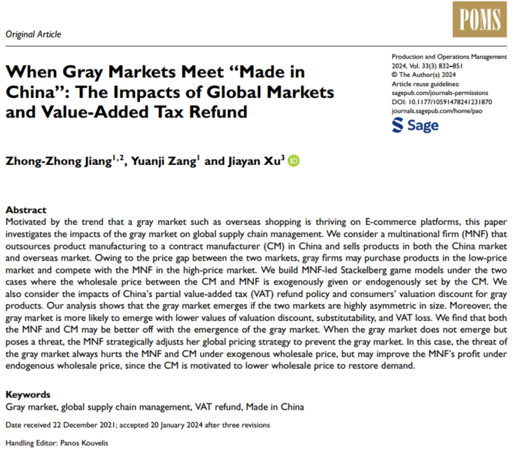 2024年3月,东北大学工商管理学院蒋忠中教授作为第一作者的研究成果“When Gray Markets Meet‘Made in China’: The Impacts of Global Markets and Value-Added Tax Refund”在UTD24期刊Production and Operations Management上发表。研究成果由东北大学工商管理学院蒋忠中教授、臧元基博士生、中山大学管理学院徐佳焱副教授合作完成。