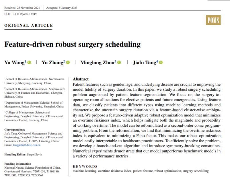 2023年6月,东北大学工商管理学院王昱副教授作为第一作者的研究成果“Feature-Driven Robust Surgery Scheduling”在UTD24期刊Production and Operations Management上发表。研究成果由东北大学工商管理学院王昱副教授、西南财经大学工商管理学院章宇教授、复旦大学管理学院周明龙青年副研究员、东北财经大学管理科学与工程学院唐加福教授合作完成。