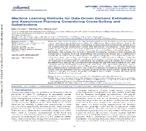 2023年1月,东北大学工商管理学院陈震宇研究员作为第一作者的研究成果“Machine Learning Methods for Data-Driven Demand Estimation and Assortment Planning Considering Cross-Selling and Substitutions”在UTD24期刊INFORMS Journal on Computing上发表。研究成果由东北大学工商管理学院陈震宇研究员、樊治平教授、美国德州大学圣安东尼奥分校孙明和教授合作完成。
