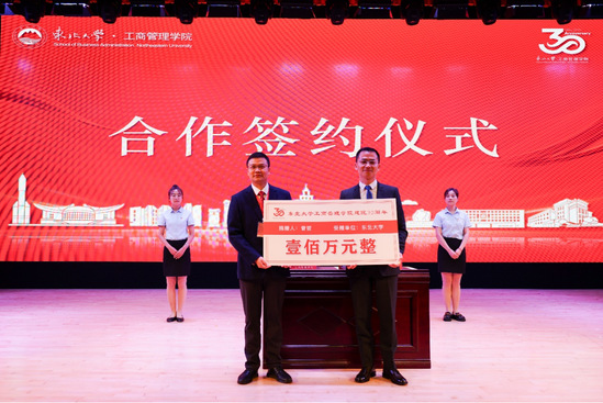 蒋忠中代表学院与中国长城科技集团、明月镜片股份有限公司分别签署战略合作协议。其中,明月镜片股份有限公司常务副总裁曾哲作为99级工商管理学院毕业生向学院捐赠100万元,并设立“管院99教育基金”,用于支持东北大学工商管理学院发展建设。