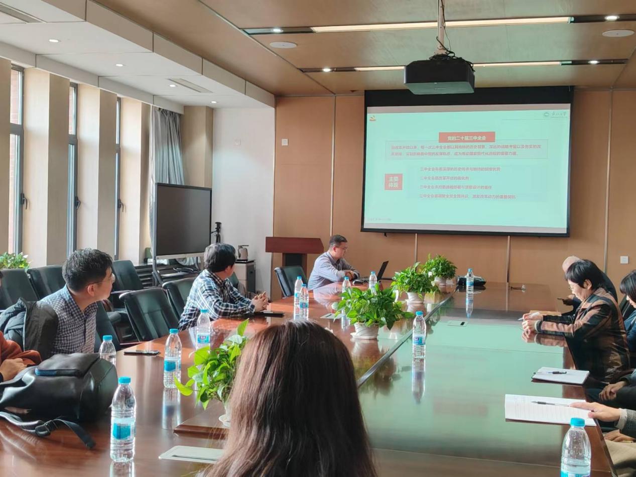 11月15日,学院院长蒋忠中在文管学馆B306室为工商管理党支部和经济学党支部讲授学习贯彻党的二十届三中全会和学校第十五次党代会精神专题党课。