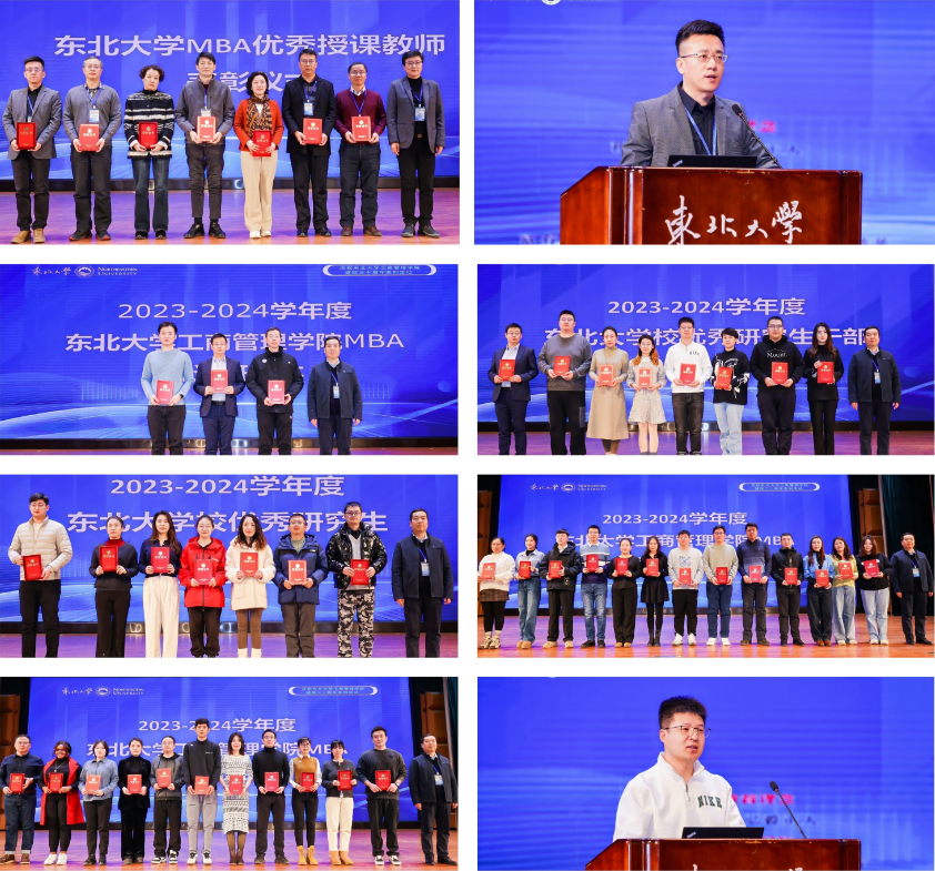 庞洪江副院长宣布东北大学MBA优秀授课教师表彰决定并向优秀授课教师颁发证书,优秀授课教师代表贾建锋副院长发表获奖感言,感谢MBA学员对教师授课工作的支持。吕煦光副院长宣布了2023-2024学年度东北大学MBA先进班集体、校优秀研究生干部、校优秀研究生、院优秀研究生干部、院优秀研究生名单并颁发了奖项。同时,东北大学2023级MBA优秀学生代表陈明鑫发表了感言。