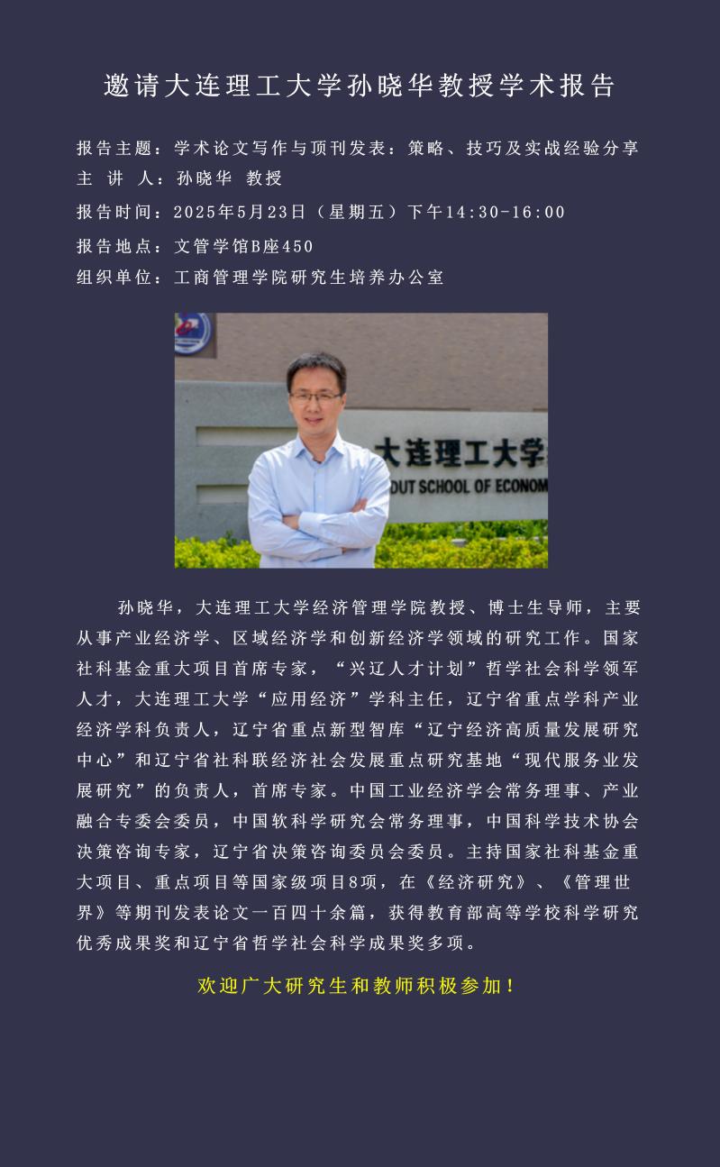 邀请大连理工大学孙晓华教授学术报告