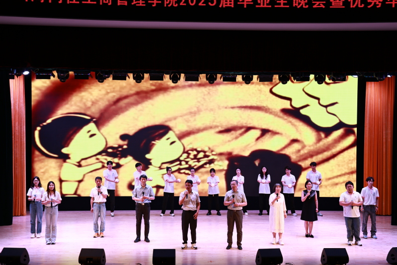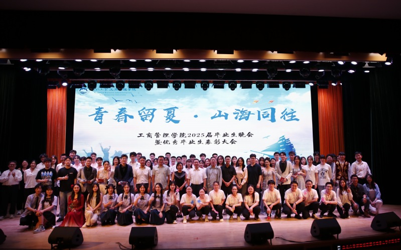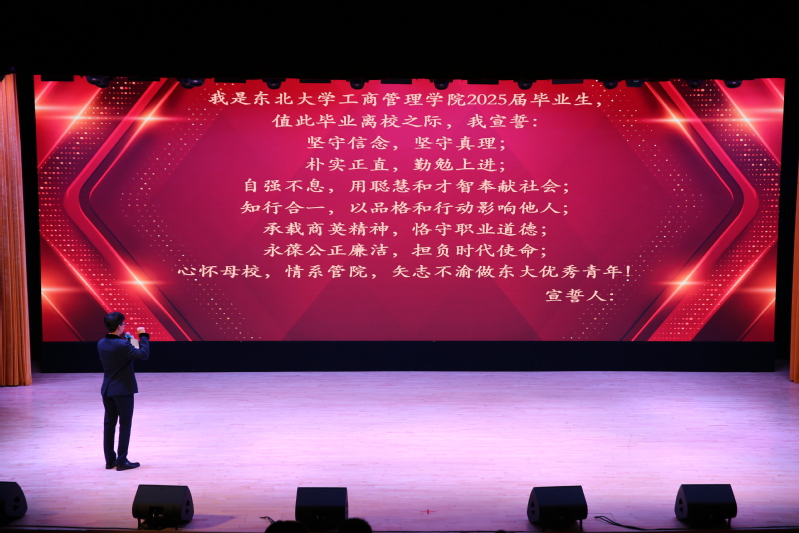 “青春留夏·山海同往”工商管理学院2025届毕业生晚会暨优秀毕业生表彰大会在学院领导老师们录制的毕业祝福视频中拉开帷幕。韩斌发表致辞,殷切叮嘱毕业生们在知行合一中始终锚定正确的人生目标,在实干报国中勇担时代使命,在创新卓越中施展远大抱负、绽放绚丽光彩!王朝全同学代表毕业生发言,他表示:母校自强不息、知行合一的校训精神已经深深镌刻于心。未来,将坚定不移以实干之姿践行报国使命,以创新之志开拓卓越未来,在时代的篇章上绘就壮丽的青春答卷!领誓人张晋玮同学带领全体毕业生庄严宣誓,全体毕业生郑重承诺将心怀母校,情系管院,矢志不渝做东大优秀青年。贾建锋宣读优秀毕业生表彰名单,与会领导嘉宾共同为优秀毕业生颁发奖项。