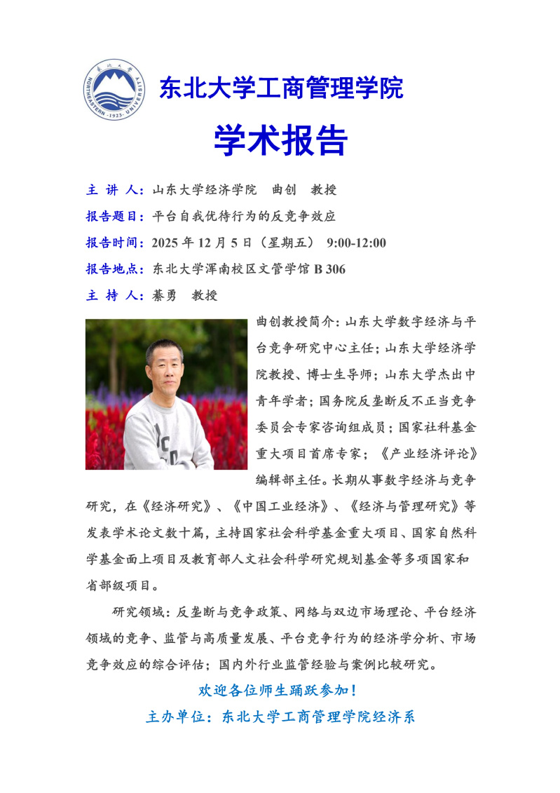 邀请山东大学经济学院曲创教授学术报告