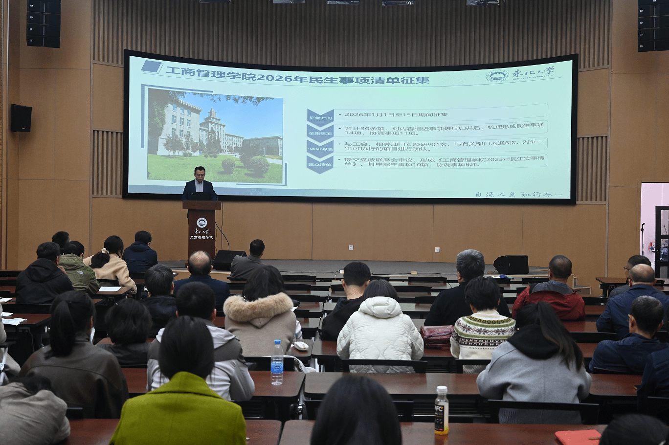 韩斌通报了2026年学院民生实事事项清单制定情况,表示2026年度民生实事清单自今年1月1日启动征集以来,半个月时间共收到各类意见建议30余项,学院党委与工会对有关事项进行了专题研究,并与多部门协调沟通十余次,形成初步清单后提交党政联席会审议。经会议研究,共确定工商管理学院2026年度民生事项10项、协调事项9项。韩斌强调,未来,学院将持续开展民生实事事项的年度征集与落实工作,力争通过不断解决师生的急难愁盼问题,进一步打造正向、和谐、温暖的软环境,为学院师生健康工作、快乐生活奠定坚实基础。(学院办公室 供稿)