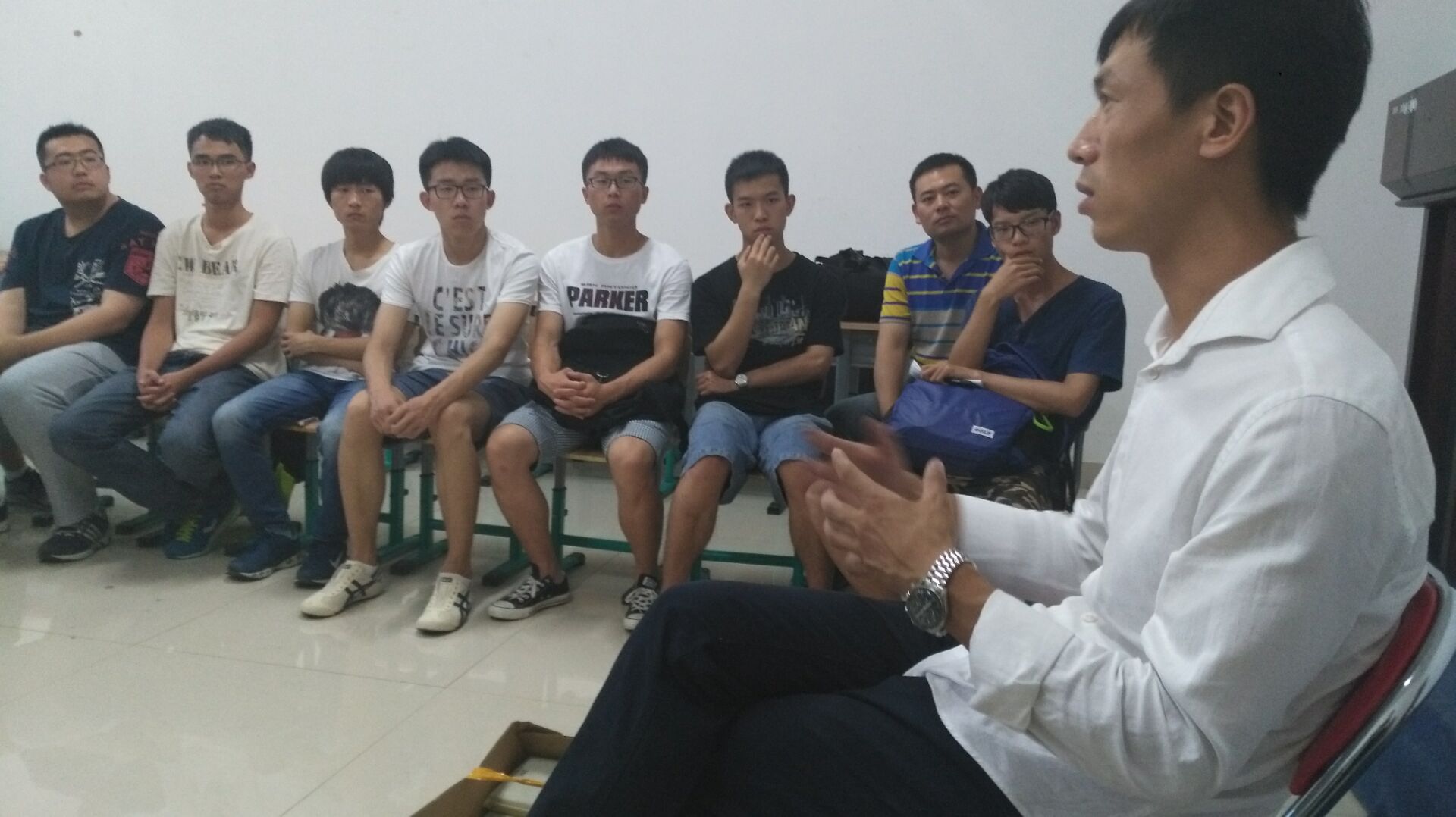 在班会开始时,首先由班长杨森代表全班同学向指导师的到来表示热烈欢迎,辅导员王寰也对陈迪老师的到来表示感谢。随后,陈迪进行了自我介绍,与同学们分享了自己的学习以及工作经历。随着班会的进行,陈迪平易近人的交流也感染了同学们,班会的气氛轻松融洽。