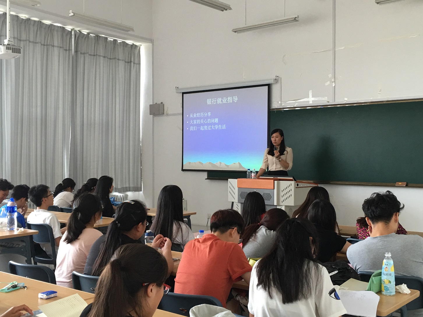 在与同学们的交流互动过程中,丁蓓通过自身经历,教大家认识职场,介绍了银行的构架和大学生入职条件,表明当下无论四大国有银行还是股份制银行,都稀缺专业全能型人才和专业精通型人才,丁蓓给予大家中肯的建议:大学毕业直接入职的同学需踏踏实实工作三年以上,切勿短时期内跳槽;对于想要读研和出国深造的同学,需切实掌握技能,成为专业化人才。最后丁蓓解答了同学们提出的各类问题,如:大学生进入银行需具备什么条件?研究生和本科生在招聘中会有什么不同?
