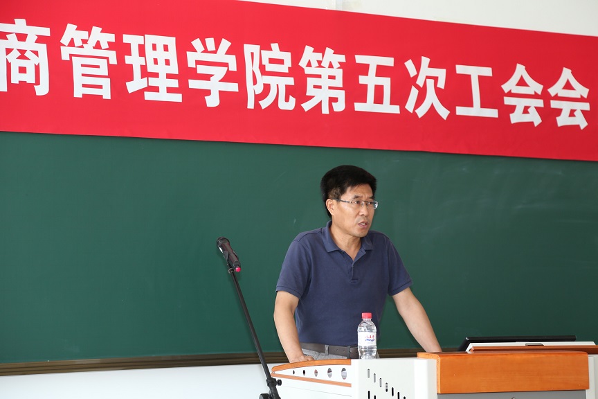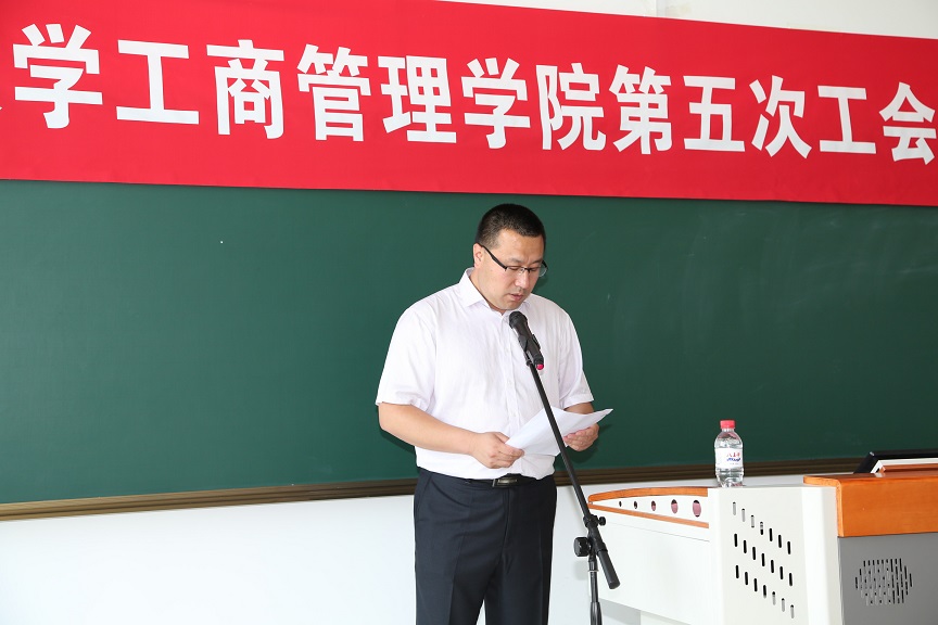 7月6日下午,工商管理学院第五次工会会员代表大会在文管学馆B112室召开。校工会主席张国联出席会议。学院领导班子成员和工会会员代表参加会议。会议由学院党委副书记兼副院长严立宁主持。