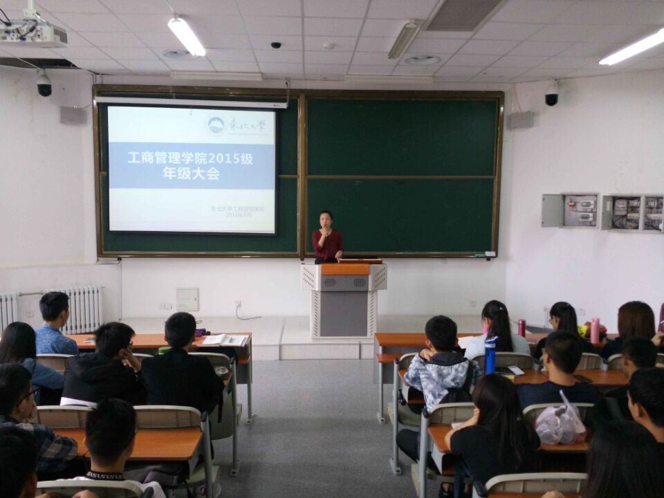 2016年9月8日上午,工商管理学院2015级新学期年级大会在浑南校区文馆楼A座447教室举行。由2015级辅导员石天老师主持大会,工商管理学院2015级全体同学参会。石天老师主要围绕上学期学习状况,本学期寝室制度要求以及校园安全三个方面与同学们进行深入交流。
