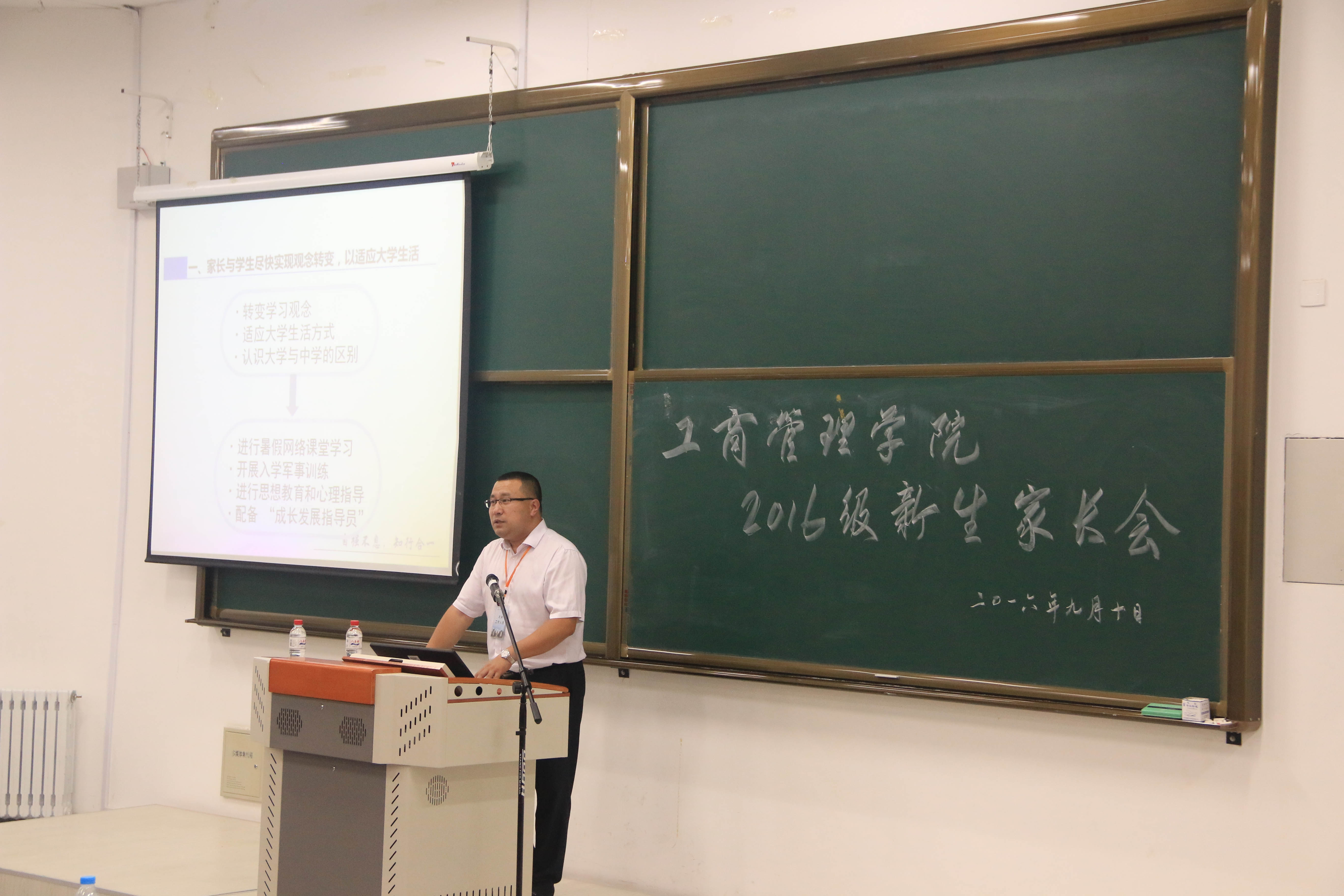 工商管理学院2016级新生家长会于9月10日下午在文管学馆A129室隆重举行,工商管理学院院长马钦海、党委书记郝树满、副院长孙新波、党委副书记兼副院长严立宁、本科课程项目管理中心主任严志刚、ACCA本科项目中心主任袁知柱、东北大学心理健康教育中心主任陈阳老师、ACCA北京代表处宋岩和学生工作办公室的各位老师出席了本次会议,会议由学院学生工作办公室主任王寰主持。