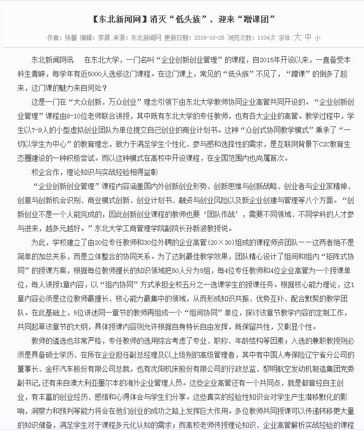 近日,《东北新闻网》和《沈阳日报》,分别以《消灭“低头族”,迎来“蹭课团”》和《东大全国首创“校企协同教学模式”,企业高管“众创”授课吸引“蹭课团”》为题对我院开设的《企业创新创业管理》课程进行了报道。