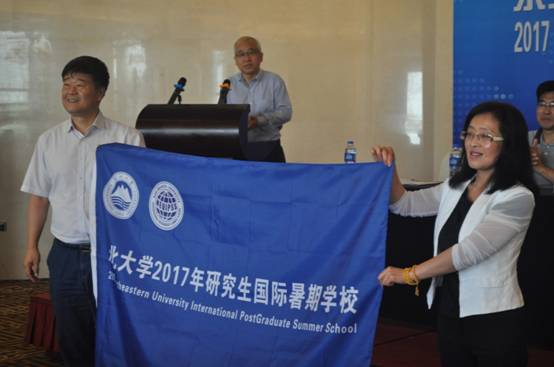 研究生院院长巩恩普向工商管理学院授予暑期学校旗帜,2017东北大学研究生国际暑期学校正式开始。