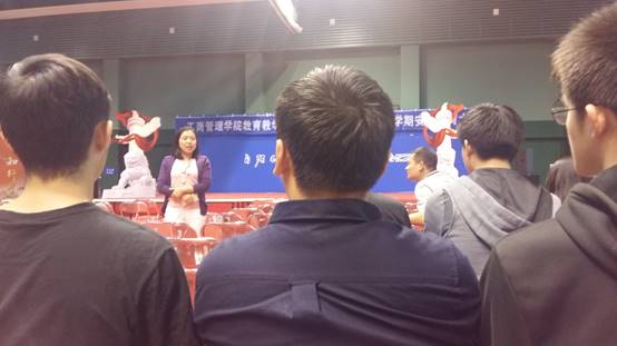 随后,王寰告知与会学生由于工作调动问题,2014级辅导员将由杨光接任。王寰回忆了过去三年与2014级同学的情谊,以鞠躬的方式表达了深深不舍和美好祝愿,并对杨光进行介绍。