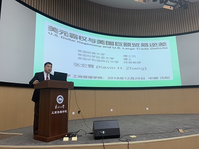 12月28日10:30,工商管理学院《美元霸权与美国巨额贸易逆差》主题学术报告会于文管楼B450室成功举办。本次学术报告会邀请到美国伊利诺州立大学经济系终身教授张宏霖作深入解读,工商管理学院党委副书记兼副院长严立宁主持会议。