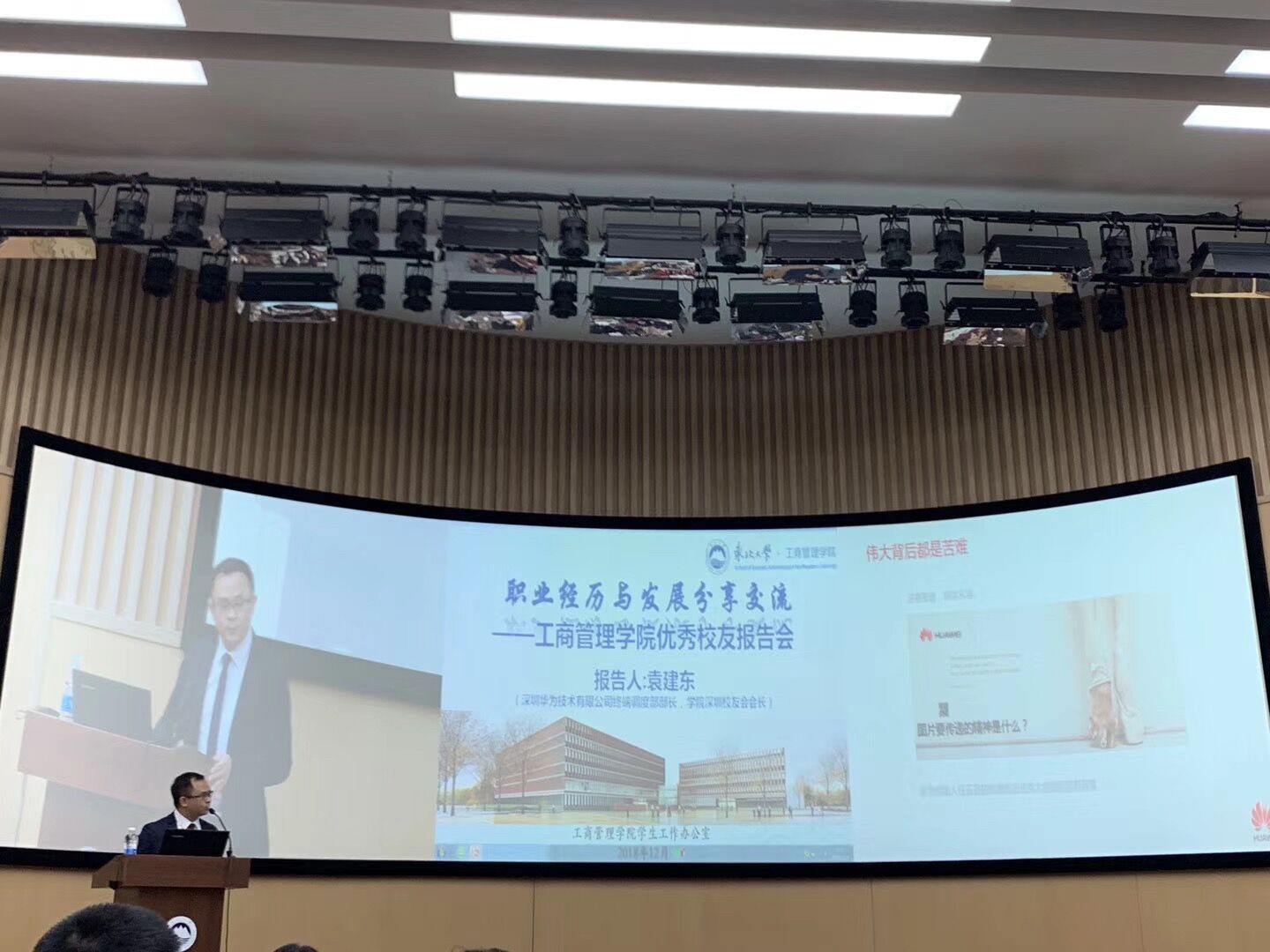 12月29日15:30,职业经历与发展分享校友报告会在文馆B450成功举办。本次校友报告会邀请到的主讲嘉宾是东北大学工商管理学院优秀毕业生、深圳华为技术有限公司终端调度部部长、东北大学工商管理学院深圳校友会会长袁建东先生。工商管理学院本科生和硕士生参加了报告会,会议由杨光主持。
