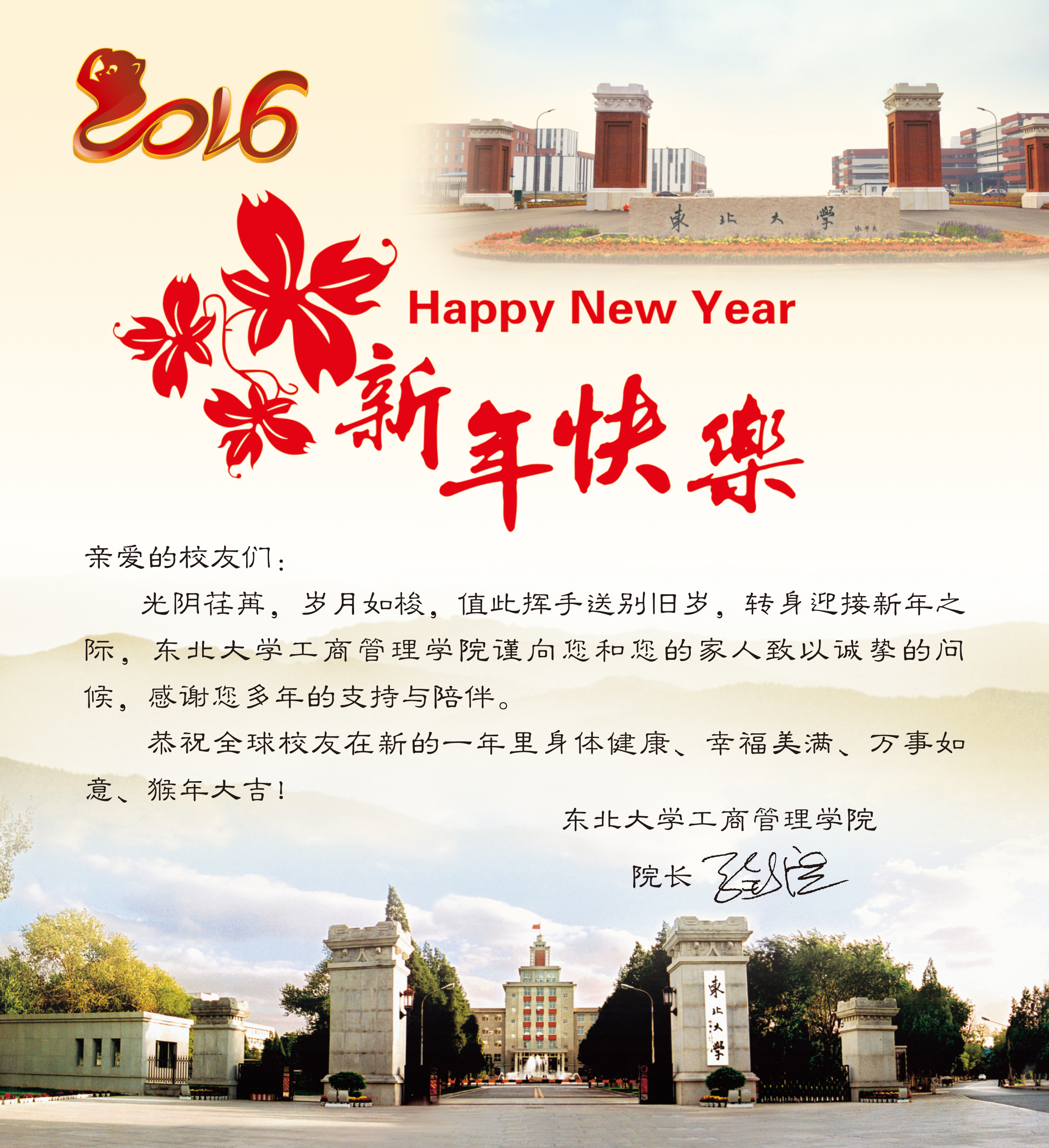 带着希望与温暖,我们即将与2015年挥手作别,满怀憧憬与期望,我们即将掀开2016年崭新的篇章,值此辞旧迎新之际,东北大学工商管理学院向海内外校友致以节日的问候!