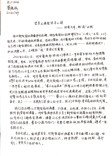 上好“疫”时党课,争做旗帜先锋。2016级本科生党支部成员积极参加“思·享”云课堂学习,认真上好这堂“疫”时思政课,用手中的笔写下对课堂所学内容的思考和感悟,在思想上进一步提高对疫情防控的认识,在工作中更有动力,更有担当,积极发挥学生党员的思想引领作用。“疫”时党课号召学生党员要认真带头完成学校布置的各项工作,真正起到先锋模范作用,让党旗在防控疫情斗争第一线高高飘扬。(图/文 2016级本科生党支部)