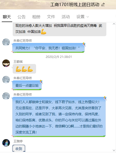 2月9日21:00,工商1701团支部“众志成城战疫情·共克时艰做先锋”线上主题团日活动顺利召开。本次团日活动内容分为学习防控会议精神、讲好中国战疫故事、网络传递温暖真情三部分,班导师朱春红、辅导员王鹤棋参与本次活动。