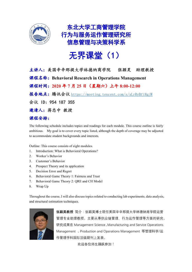 邀请美国辛辛那提大学张颖昊助理教授做客"无界课堂"
