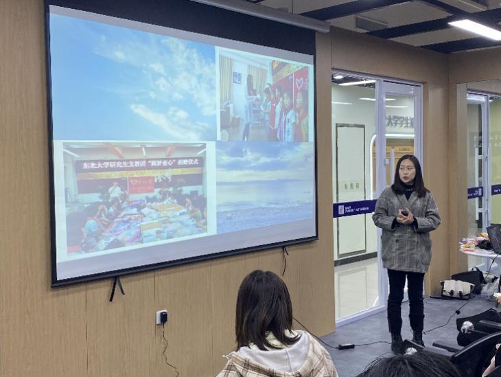 活动第一部分为“敢担当,战疫扶贫在行动”。首先,东北大学研究生支教团成员赵洋学姐分享了自己在四川省绵阳市三台县进行支教活动的心得体会。其次,佟硕同学带领大家观看世界疫情变化视频,从工业、农业、商业等方面介绍了中国在疫情期间扶贫任务的艰巨,并根据所讲内容提出国家主要扶贫政策。