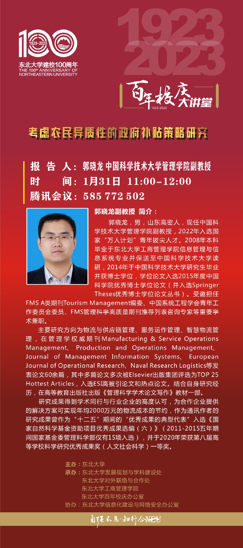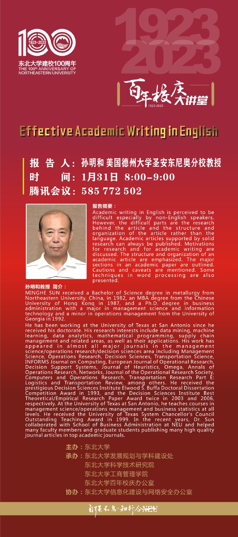 兔年新春喜迎东北大学百年华诞,“东大合家欢、新春庆百年”系列活动已拉开帷幕,1月31日上午是“百年校庆大讲堂”工商管理学院专场,学院邀请来自美国德州大学圣安东尼奥分校孙明和教授、苏州大学商学院院长冯博教授、澳大利亚墨尔本大学邵鲁生副教授、中国科学技术大学郭晓龙副教授4位知名学者&校友代表分享精彩主题报告,诚挚邀请广大师生积极参与,开启兔年第一场校友学术盛宴!