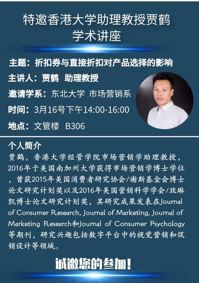 邀请香港大学经管学院贾鹤助理教授学术报告