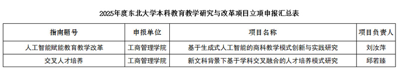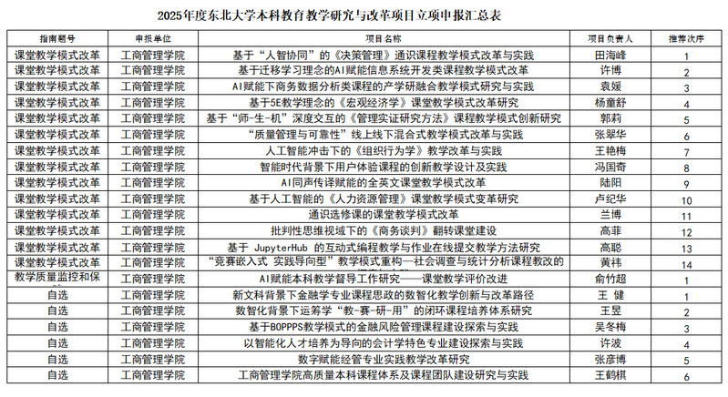 根据教务处《关于开展2025年度东北大学本科教育教学研究与改革项目立项申报工作的通知》的要求,学院组织开展了申报遴选工作,经过个人申报、专家组评审、党政联席会审议等程序,拟推荐以下项目推报至学校教务处,现将拟推荐结果予以公示。