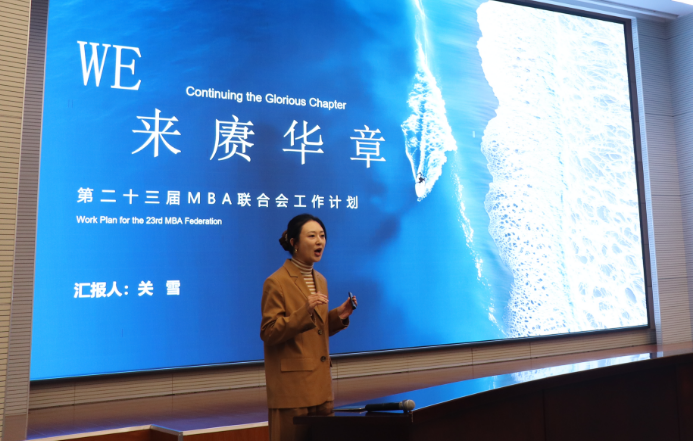 第二十二届MBA联合会主席毕佳莹全面总结过往一年工作。她在汇报中回顾梳理了迎新晚会、夏日音乐节、校史馆参观、篮球嘉年华、职场赋能课堂等重点活动,寄语新一届联合会传承创新,推出更多有助于学员成长的活动。