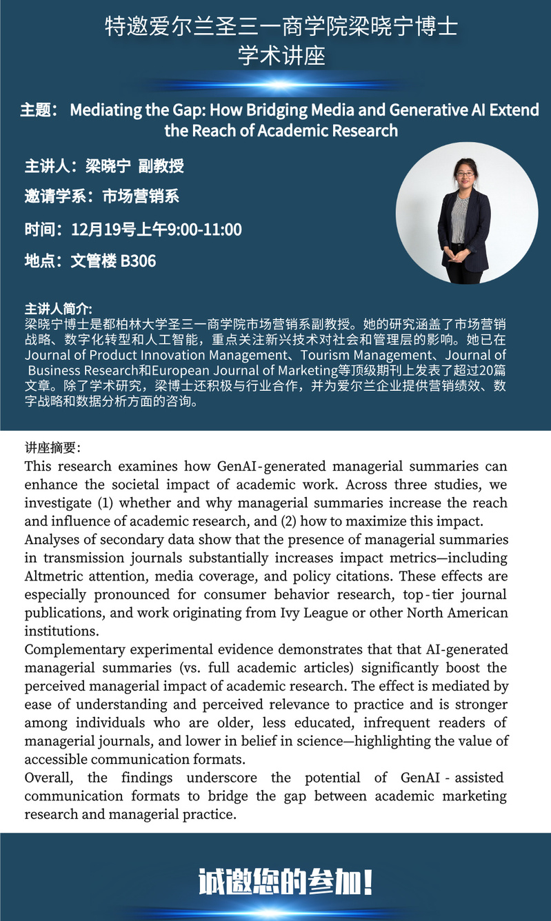 邀请爱尔兰圣三一商学院梁晓宁副教授学术报告